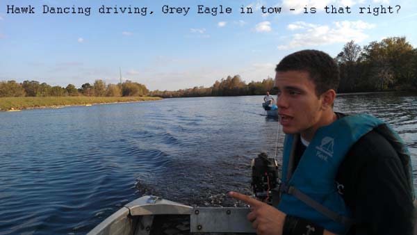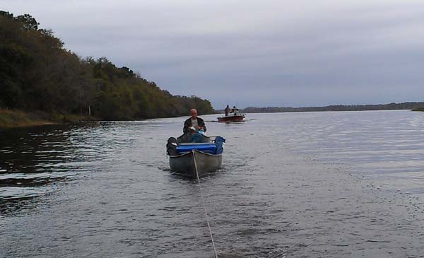 We took two canoes along so we would have plenty of cargo room, but also so that we'd have canoes to paddle around on the river near camp. We tied the canoes to the smaller motorboat and travelled "train fashion" into camp.